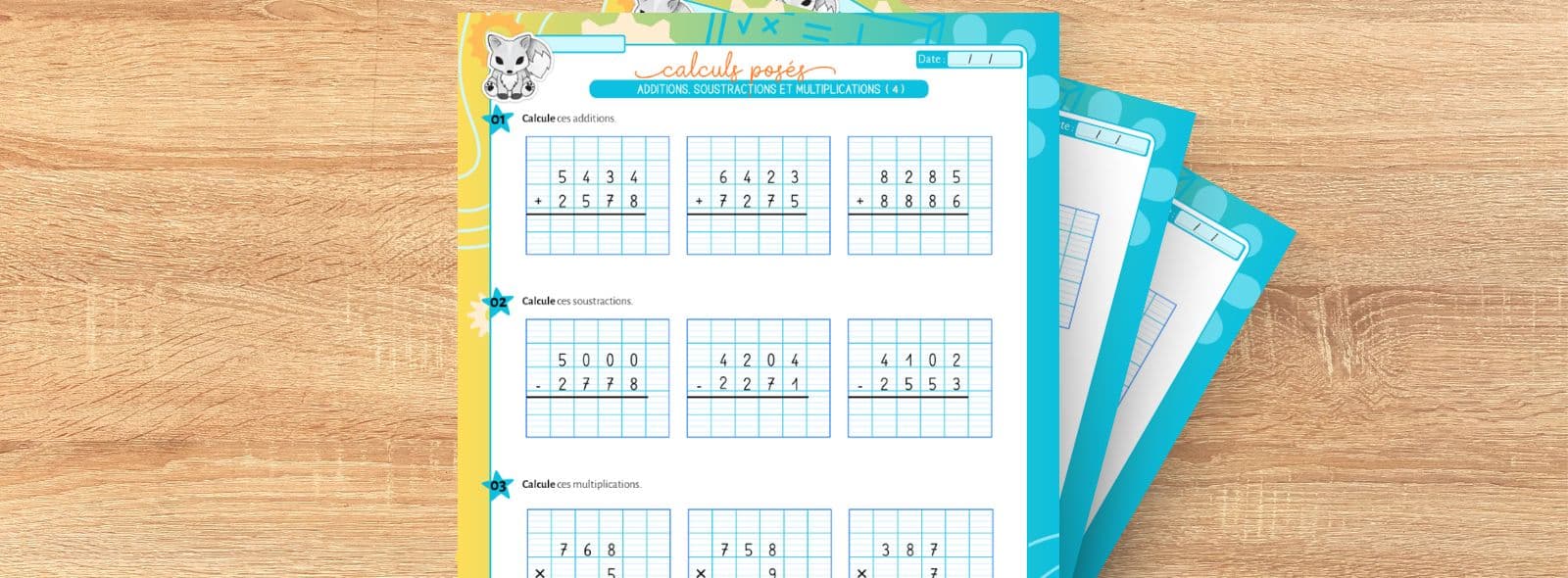 Je partage ici quatre fiches d’exercices avec de très nombreux calculs posés. Les fiches sont pensées avec une difficulté croissante : additions, soustractions puis multiplication (1 chiffre, 2 chiffres). Les corrections sont fournies.